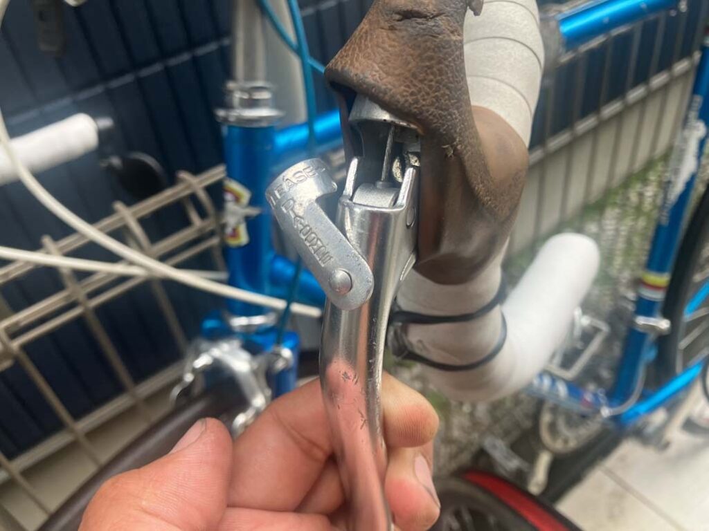 ところが、1980年代以前のスポーツ自転車はまるでカマキリの触覚のようにブレーキワイヤーがにゅいーんとハンドルの上に出ており、そのままひっくり返すとこのワイヤーが曲がってしまってブレーキがダメになる。なので、このワイヤーをブレーキレバーから外す必要があり私のユーラシアにはこのワイヤーをブレーキレバーのところでちょいちょいっと外せる機構が備わっていて(レバーの根元がカパッと開いてワイヤーにアクセス)、ちょいちょいっと外して新幹線で輪行してきた由。