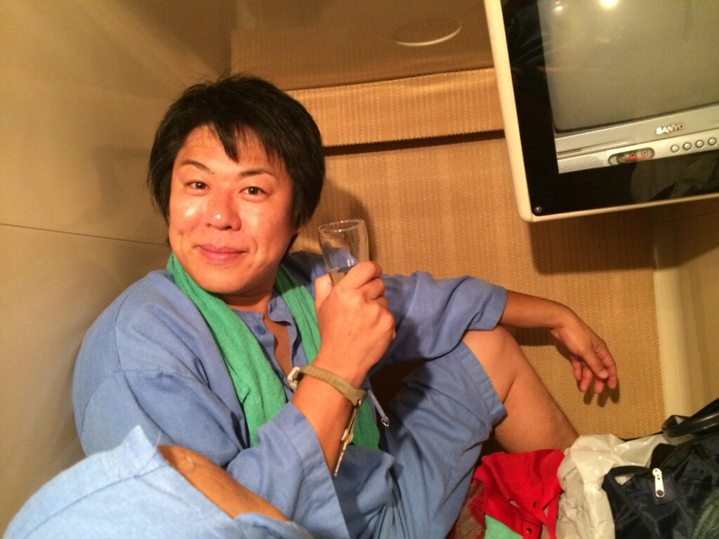 サッカーの試合(我が町田ゼルビア vs ブラウブリッツ秋田)に合わせて秋田市でライブを企画してくれた時は市内で何かの学会があってホテルが全滅で一緒にカプセルホテルに泊まって狭い中で缶ビールを呑んだりもした。その時の写真。
