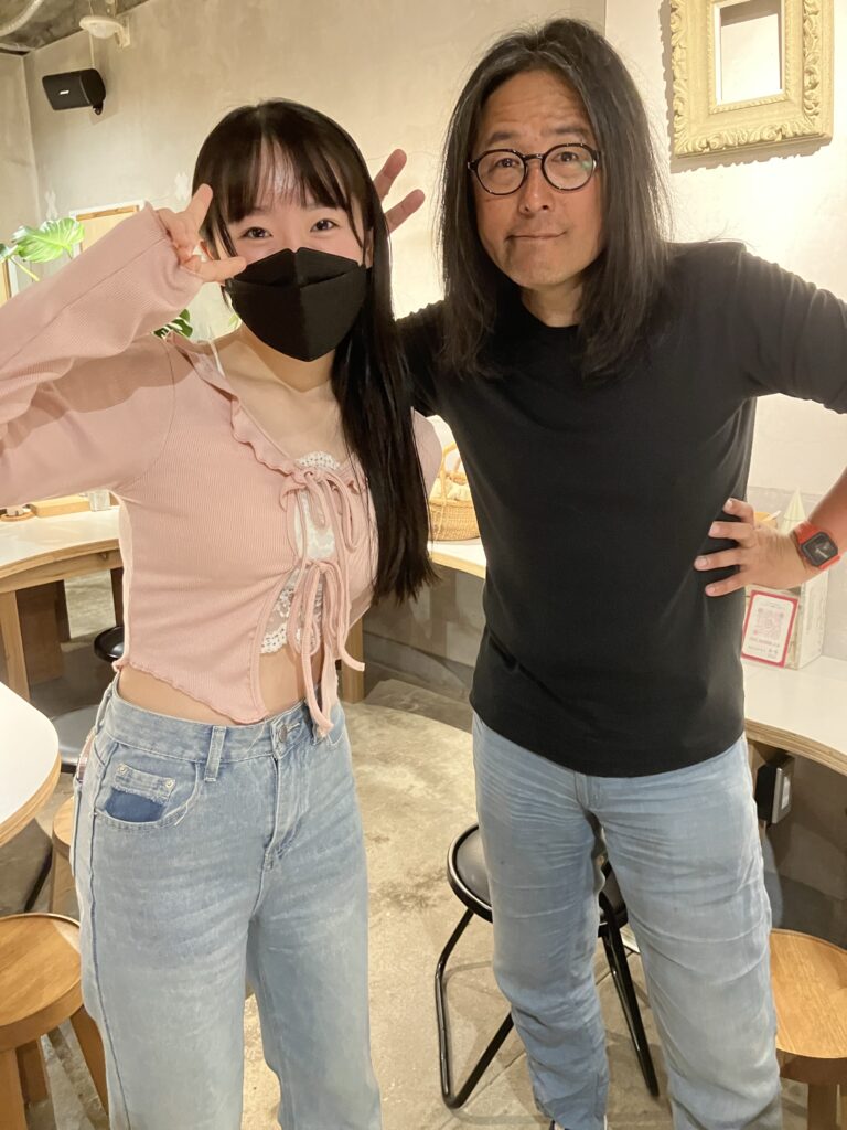 菊池店長と佐々木さんと、出発前の一枚。左が菊池店長、右が常連の佐々木さん、ワザと目瞑り。